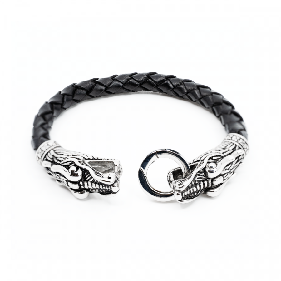 doppeltes drachenarmband aus stahl und leder. Der verschluss ist dank eines massiven runden karabinerhakens extrem sicher.