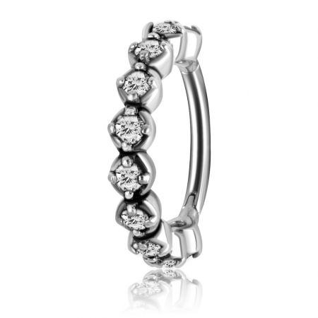 A delicate gold-plated steel headband with external thread embellishes your look thanks to the premium zirconia crystals that make up the spare part. Join it with a bar or labret with internal thread and you will see how your helix piercing will not go unnoticed.