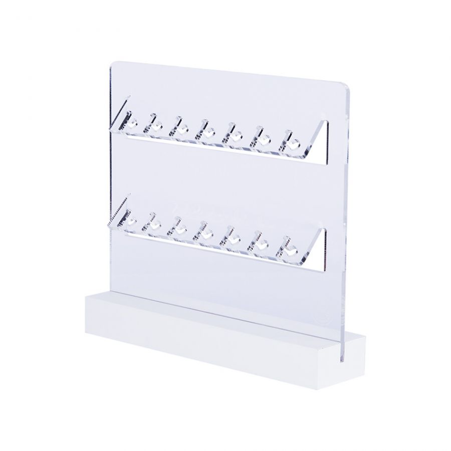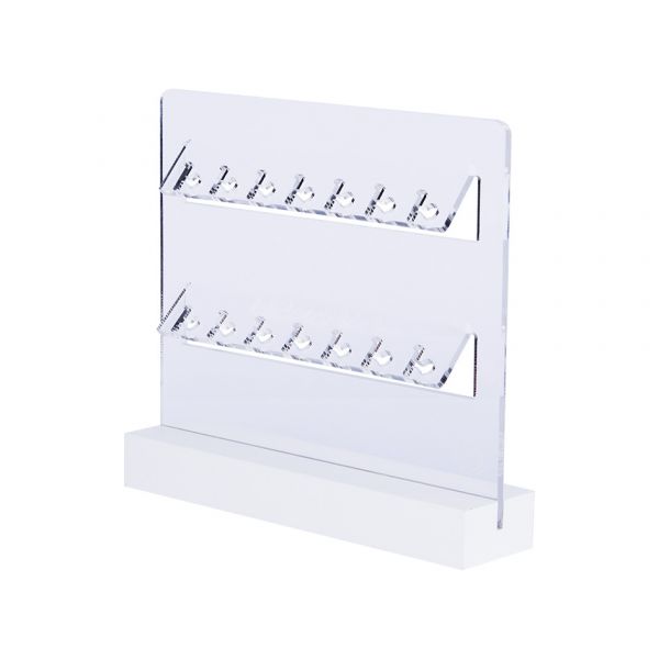 moderna exhibición con base de madera plástica blanca y láminas de acrílico transparente, diseñada para realzar el brillo de sus joyas.