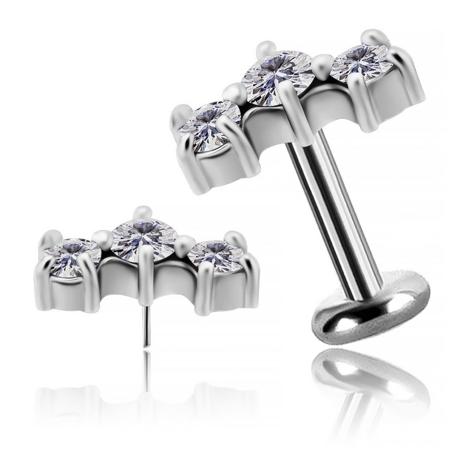 este refinado pendiente threadless cuenta con un labret de titanio y un elemento decorativo adornado con tres luminosas premium cubic zirconia blancas, caracterizadas por un brillo intenso y dispuestas en un delicado arco. Fabricado en aleación de cromo-cobalto, 100% libre de níquel. Las excelentes propiedades de esta aleación permiten crear joyas ligeras pero extremadamente resistentes, con un acabado preciso y superior al de los metales tradicionales.
