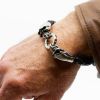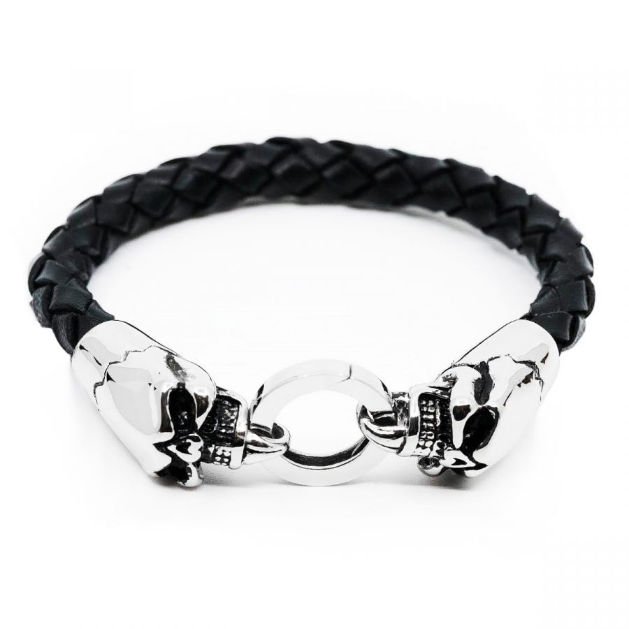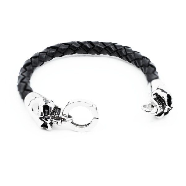 bracelet with a double skull in surgical steel, paired with a refined black braided leather strap. The closure is solid and durable, thanks to a sturdy round lobster clasp designed to ensure maximum security during use.