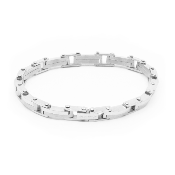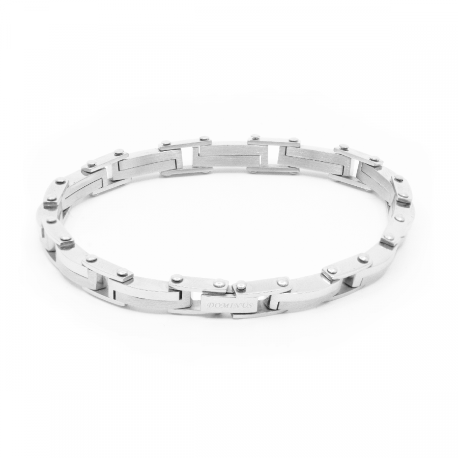pulsera de acero con elementos mitad pulidos y mitad satinados. El cierre, también de acero, es muy seguro y duradero.