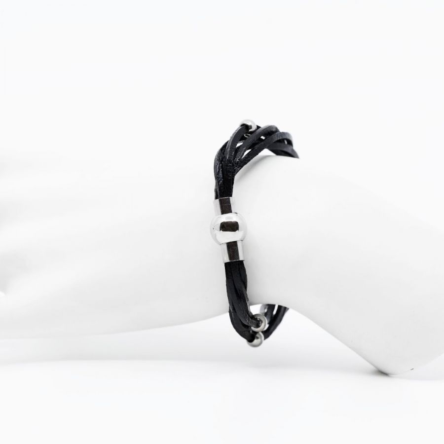 pulsera elaborada con finos hilos de cuero negro, cuidadosamente trabajados y decorados con elegantes esferas. El diseño se completa con un práctico cierre magnético en forma de esfera de acero quirúrgico, pensado para garantizar comodidad y facilidad de uso en cualquier ocasión.