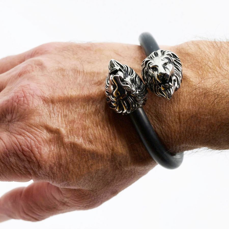 pulsera de caucho negro flexible, resistente y cómoda de llevar, realzada con dos leones de acero quirúrgico que transmiten fuerza y un estilo moderno. Un accesorio de carácter firme y diseño distintivo, ideal para quienes desean destacar con un detalle único y dinámico, manteniendo altos estándares de calidad en los materiales.