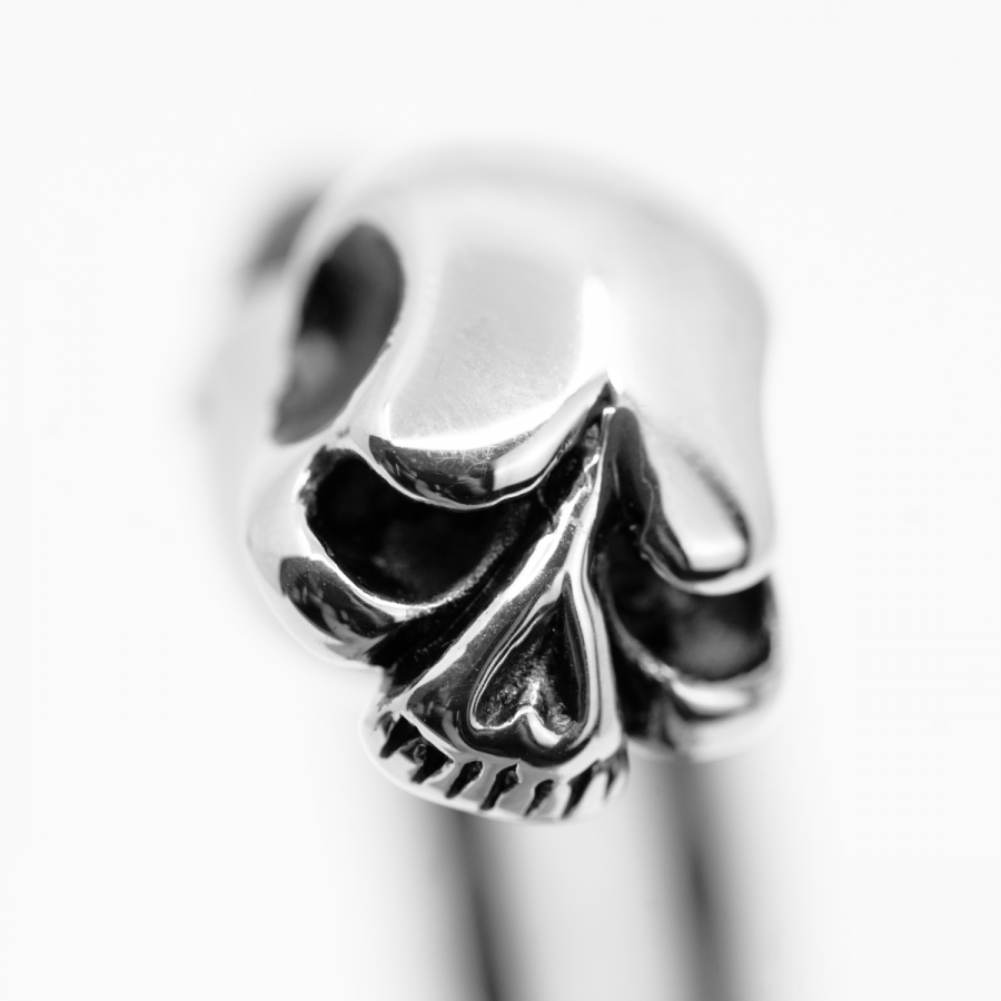 pulsera elaborada con dos segmentos de cuero trenzado y una calavera de acero. Para cerrarla, simplemente pase la calavera por la presilla y asegúrela con el cierre deslizante.