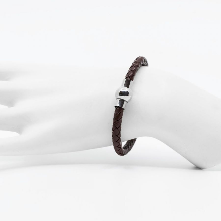 bracelet tressé en cuir marron foncé avec un fermoir en acier chirurgical en forme de sphère magnétique.
