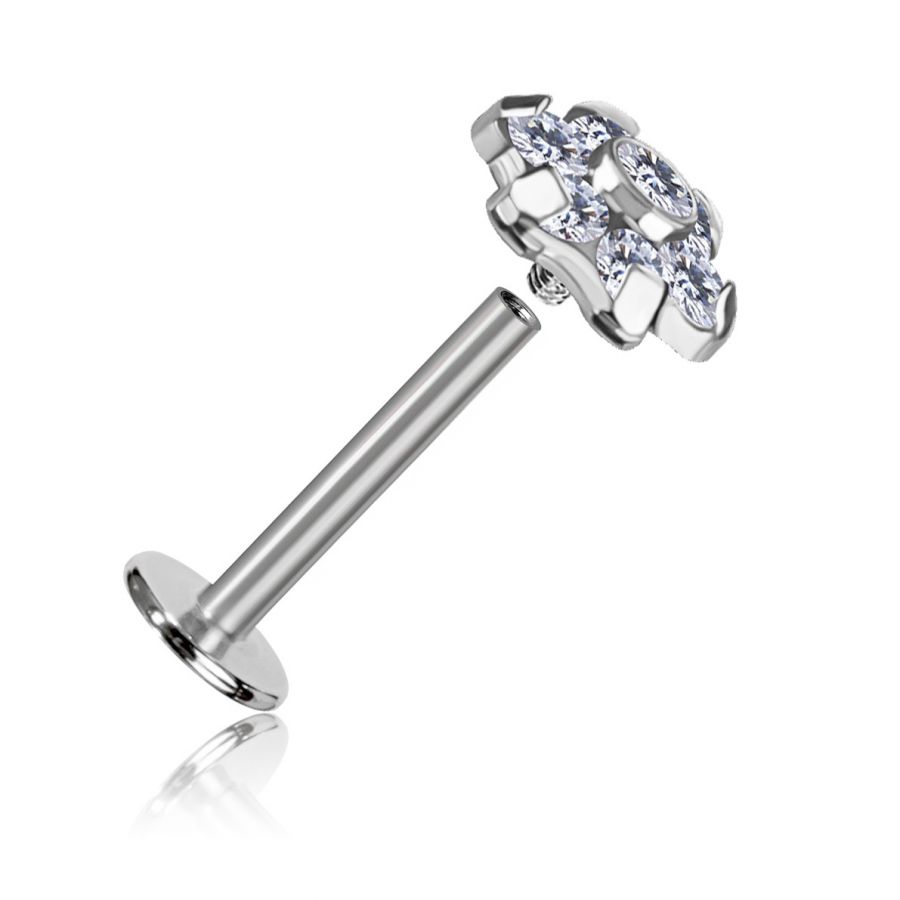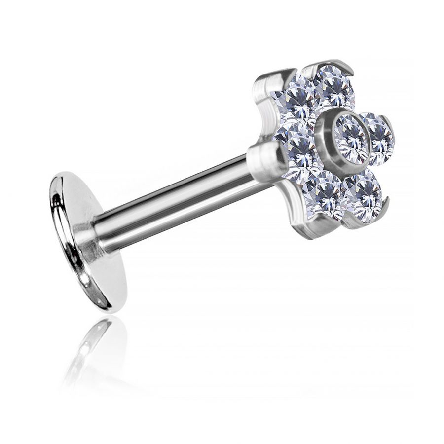 un labret en titane avec un accessoire en forme de fleur serti de six pétales de cristal, dont un central, le tout en zircone premium, offrant un éclat remarquable.