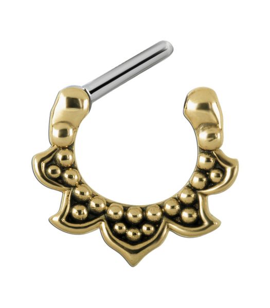 Original septum clicker avec des décorations orientales. La barre qui s’applique sur la cloison nasale est en acier chirurgical 316l, et l’autre partie du bijou est en cuivre. On utilise pour le lobe, daith et forward helix piercing. Deux diamètres disponibles.
