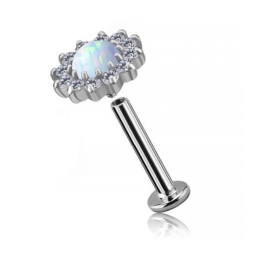 questo labret in titanio esalta la luce con un magnifico opale bianco al centro, avvolto da dodici scintillanti cristalli in premium cubic zirconia incastonati in una brillante lega di cromo-cobalto. 100% nichel free. Per un look luminoso e sicuro ogni giorno.