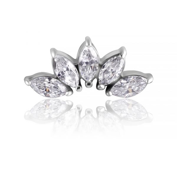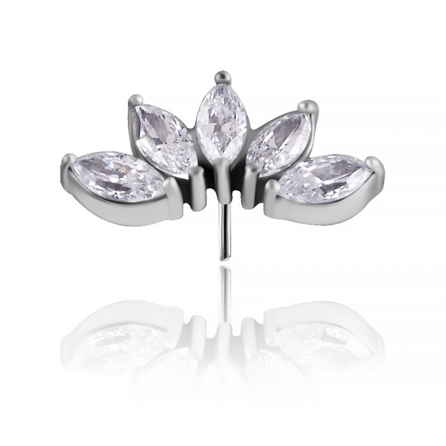 ricambio senza filetto a forma di fior di loto di materiale in lega cromo-cobalto di alta qualità, adornato con cinque lucenti cristalli bianchi in premium cubic zirconia.